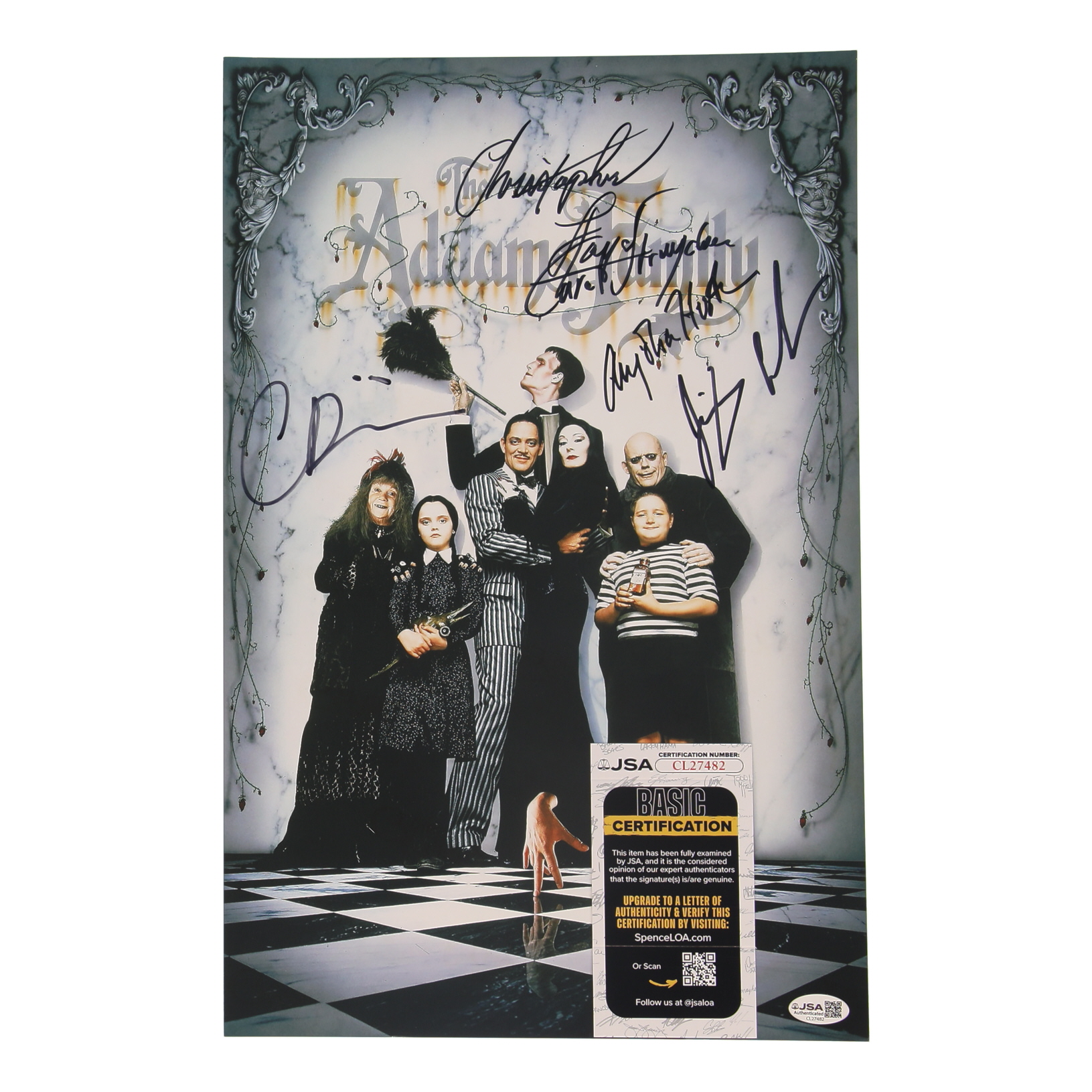 Photo measures 11" x 17" in size and has been hand-signed by Christina Ricci, Anjelica Houston, Christopher Lloyd, Jimmy Workman, and Carel Struycken.