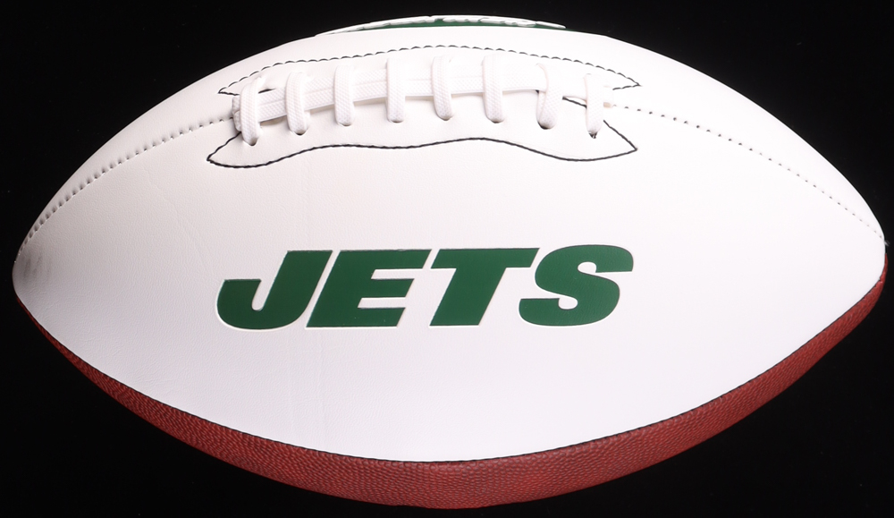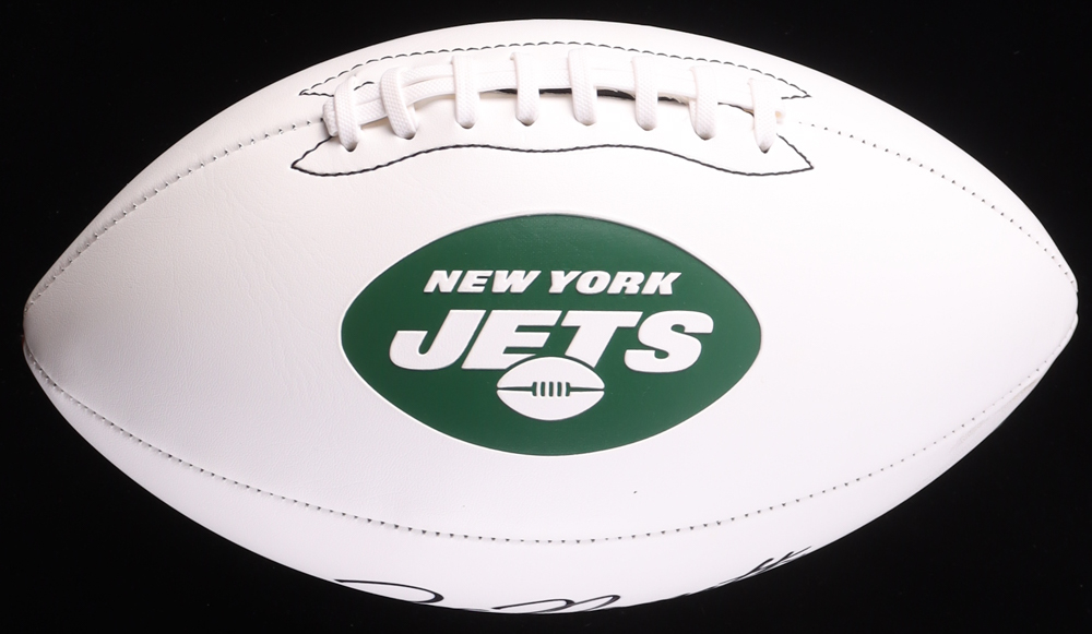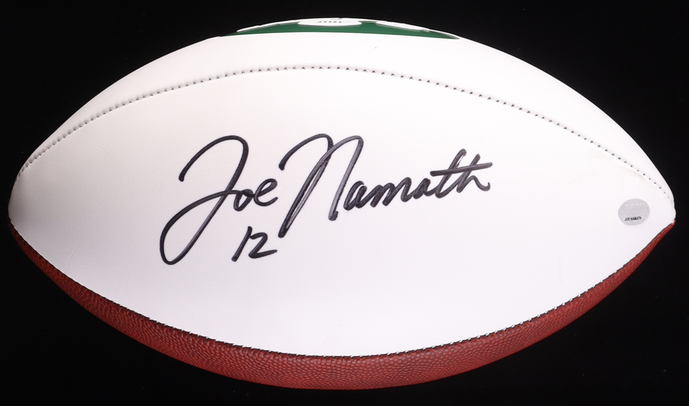 Wilson New York Jets Logo Football has been hand-signed by Joe Namath (HOF). The display case is included in the listing as shown above as well as the Miami Dolphins Logo pin. Please see photos for more details regarding the item as the football shows signs of natural toning and staining.