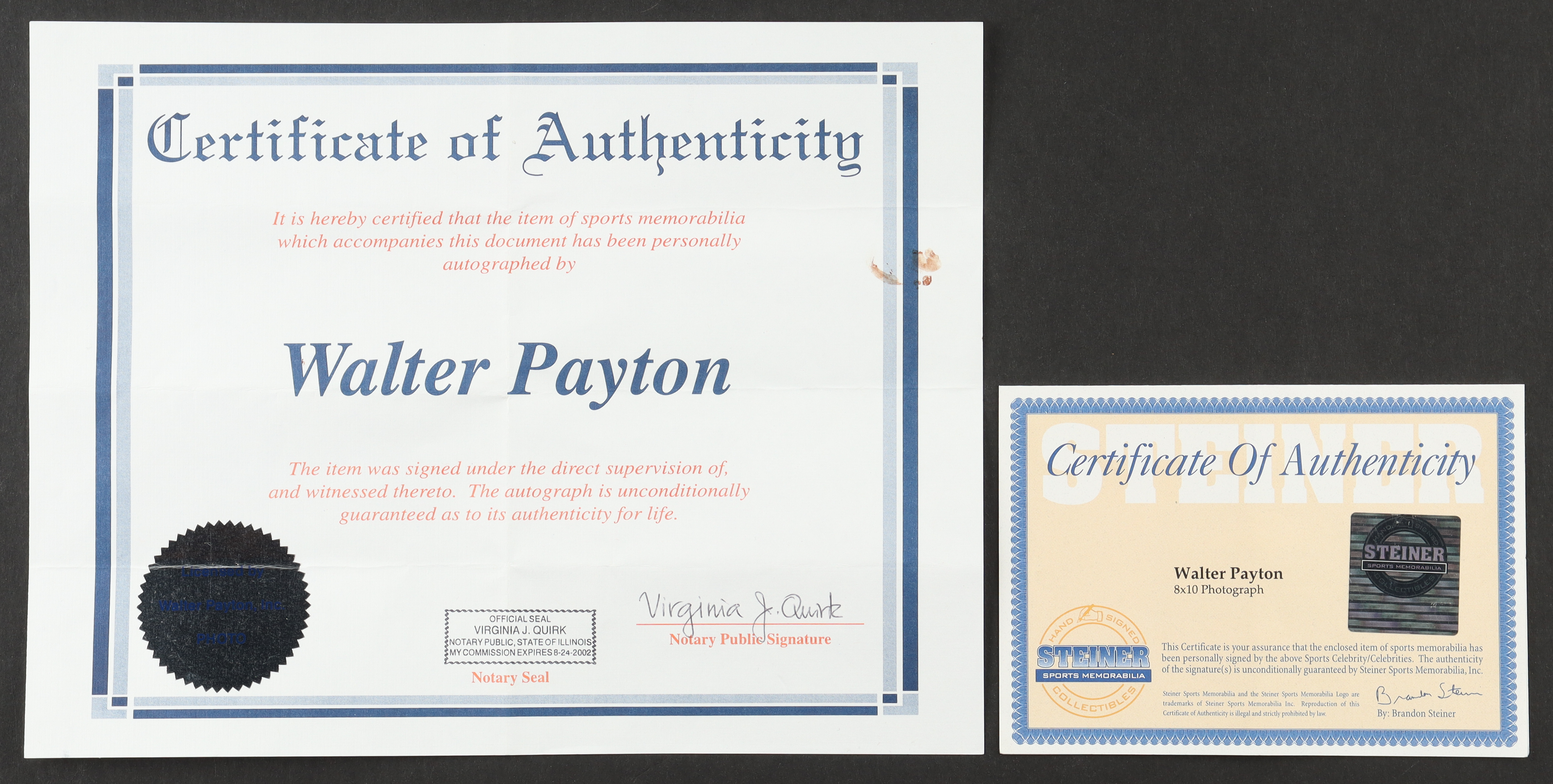 The lot / autograph(s) includes an official Steiner hologram and matching COA as well as an official Walter Payton player hologram for authenticity purposes.