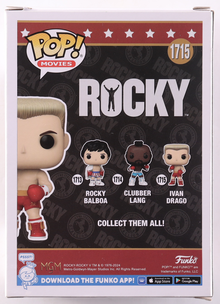 Funko Pop! vinyl figure measures approximately 4" in height and has been hand-signed on the packaging by Dolph Lundgren.