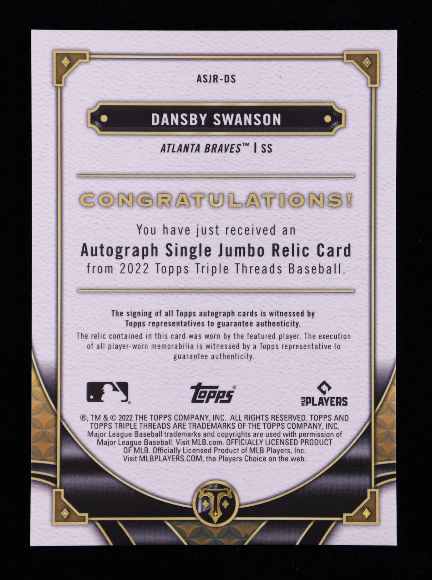 Dansby Swanson 2022 Topps Triple Threads Single Jumbo Relic Autographs #ASJRDS #04/99