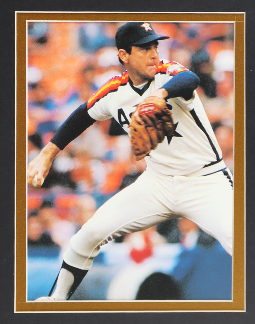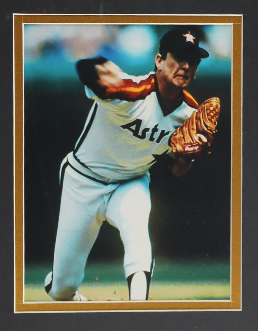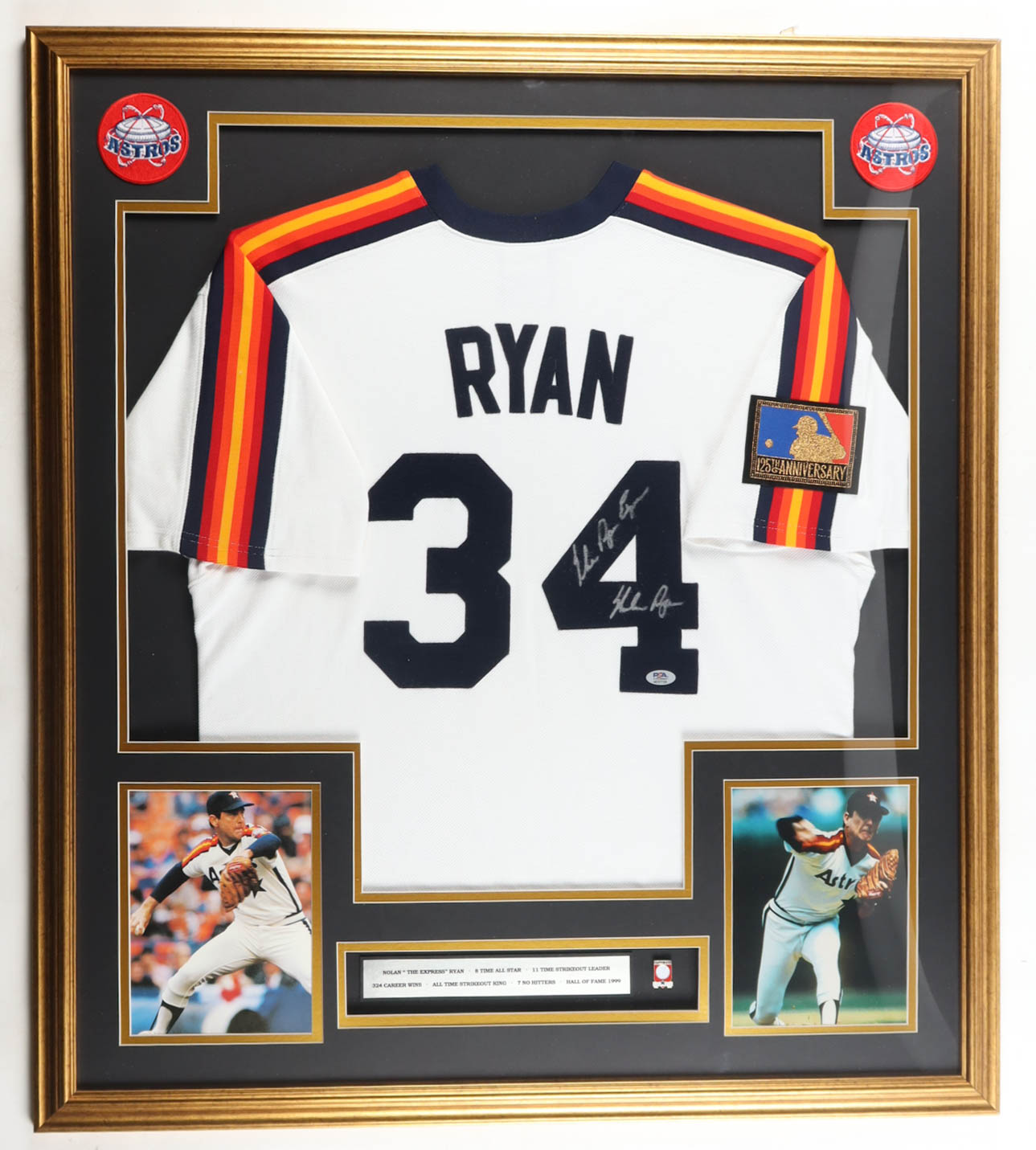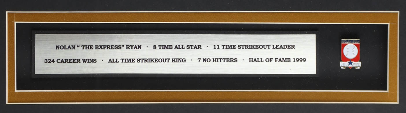 Custom frame display measures approximately 32" x 36" in size and features a jersey that has been hand-signed and inscribed by Nolan Ryan (HOF). The display also includes a Hall of Fame Induction pin, (2) 8" x 10" photos and (2) cloth team logo patches and a career statistics plaque.