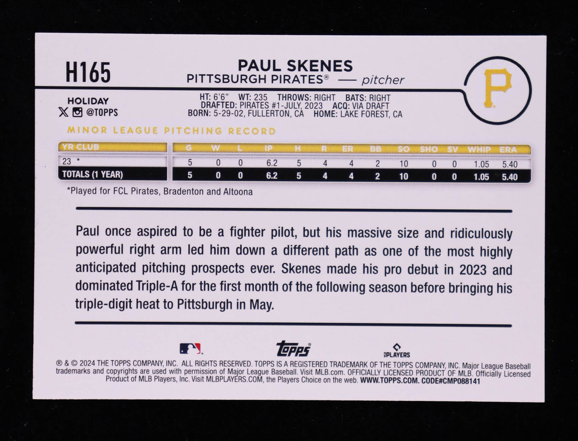 Paul Skenes 2024 Topps Holiday Metallic Blue Tree #H165 RC