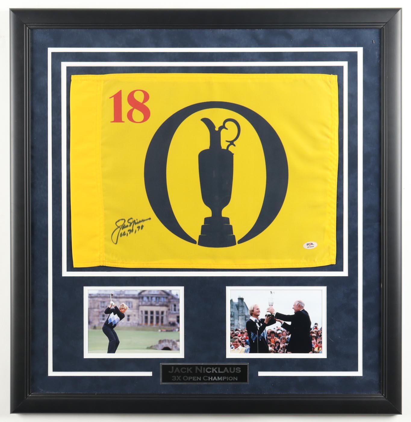 Jack Nicklaus Signed Custom Framed The Open Championship Golf Pin Flag Inscribed "66, 70, 78" (PSA)