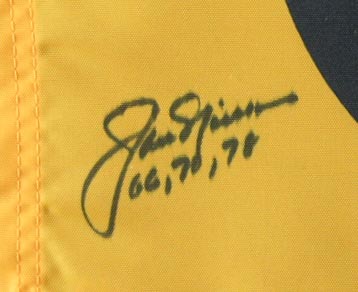 Custom frame measures approximately 28" x 28" in size. Featuring a pin flag that measures approximately 13" x 17" in size and has been hand-signed and inscribed by Jack Nicklaus (HOF). Please see photos for more details regarding the condition of the item. Display also features (2) 5" x 5" photos and a name plaque.