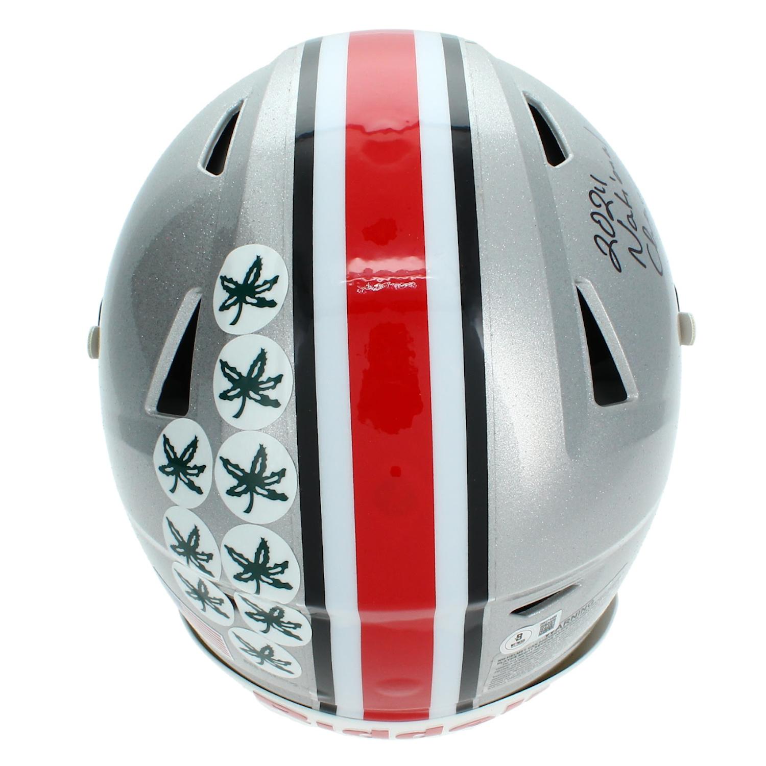Riddell Ohio State Buckeyes full-size authentic on-field speedflex helmet has been hand-signed and inscribed by Quinshon Judkins.