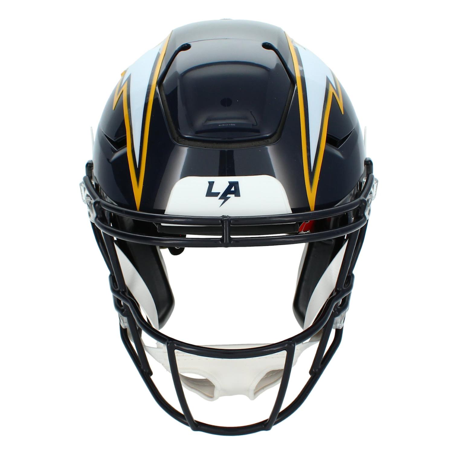 Riddell Los Angeles Chargers full-size authentic on-field speedflex helmet has been hand-signed and inscribed by Omarion Hampton.