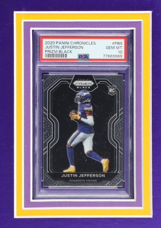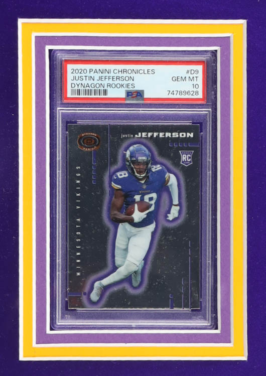 Custom framed display measures approximately 34" x 41" in size and features a jersey that has been hand-signed by Justin Jefferson. Also included are 2020 Panini Prizm Black #PB9 RC, and 2020 Panini Dynagon Rookies #D9 RC, both graded PSA (10).