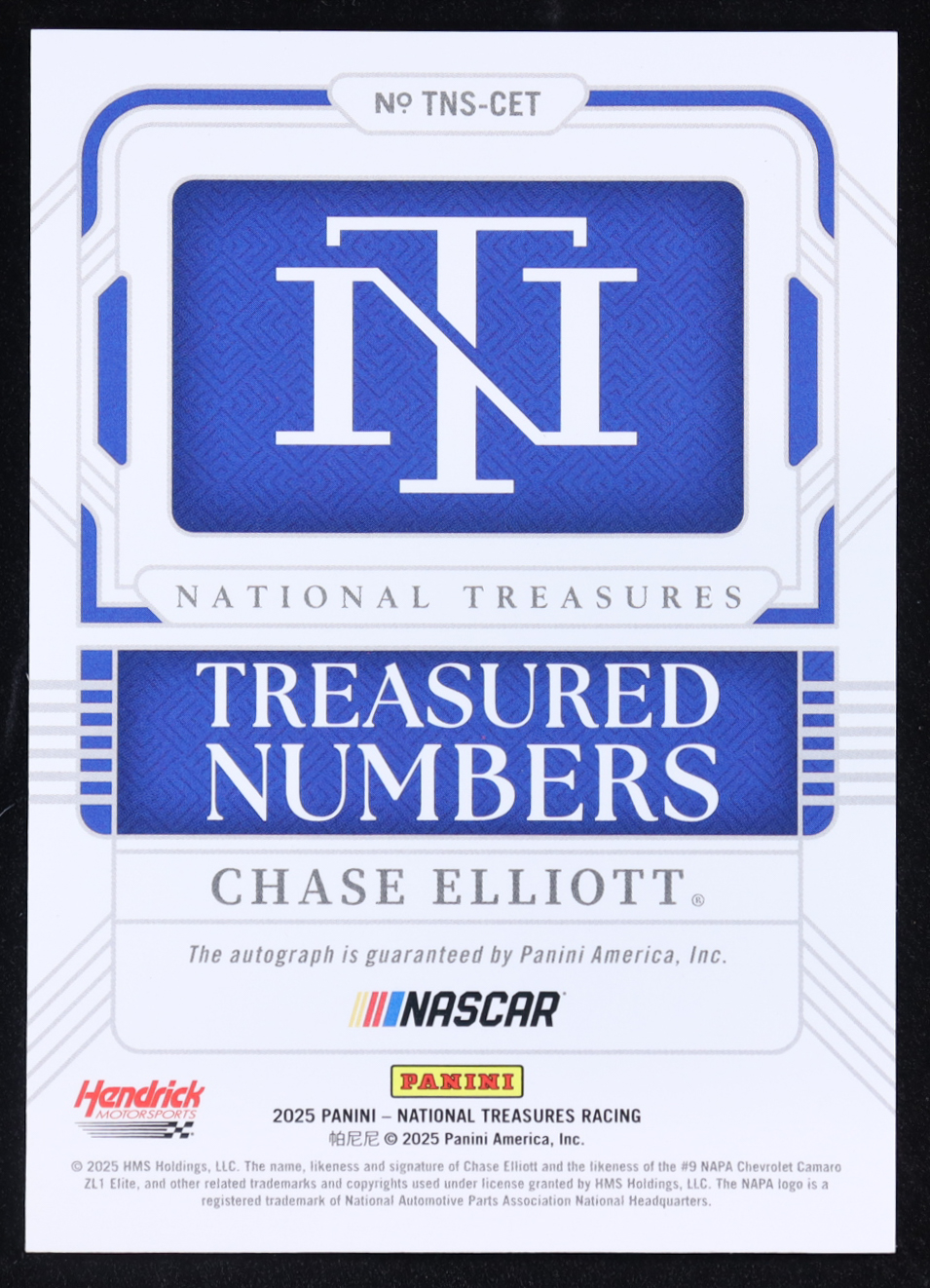 Chase Elliott 2025 Panini National Treasures Treasured Numbers Signatures #9 #6/99