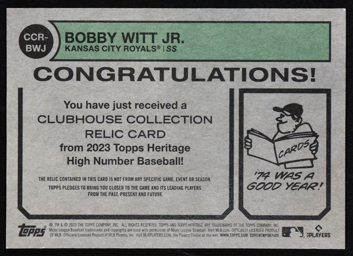 Bobby Witt Jr. 2023 Topps Heritage Clubhouse Collection Relics #CCRBWJ HN