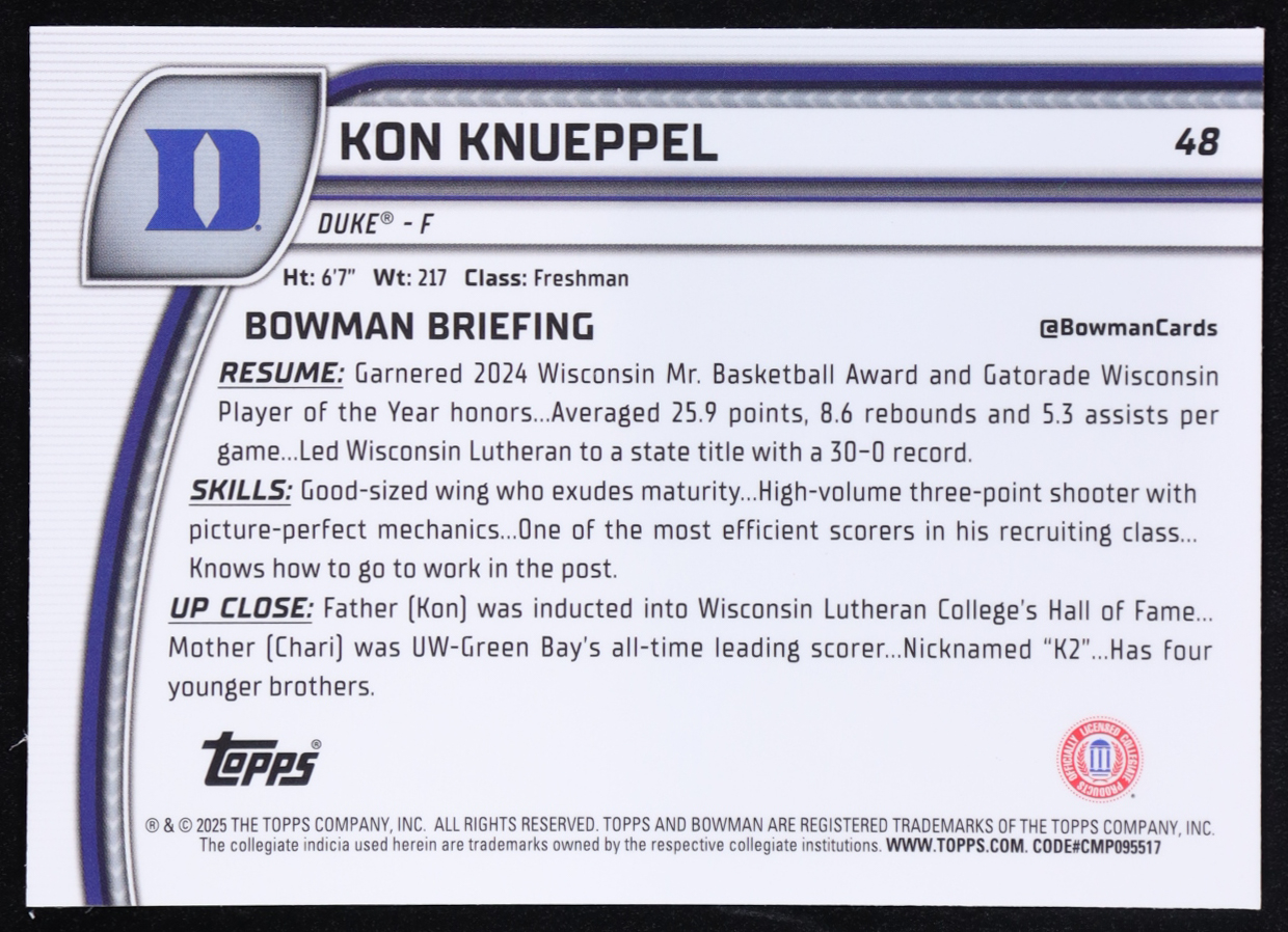 Kon Knueppel 2024-25 Bowman Chrome University Black Wave Refractors #48 RC