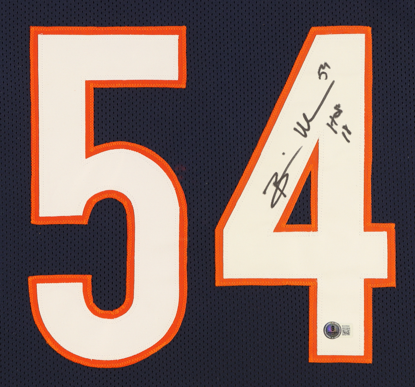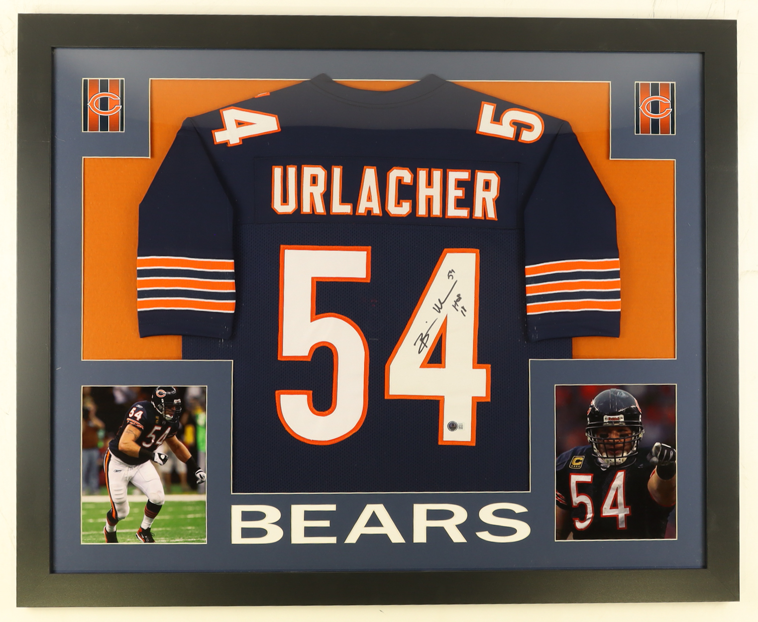 Custom frame measures 35" x 43" in size and features a jersey hand-signed and inscribed by Brian Urlacher (HOF). Please note that the 8" x 10" photos may be in reverse order.