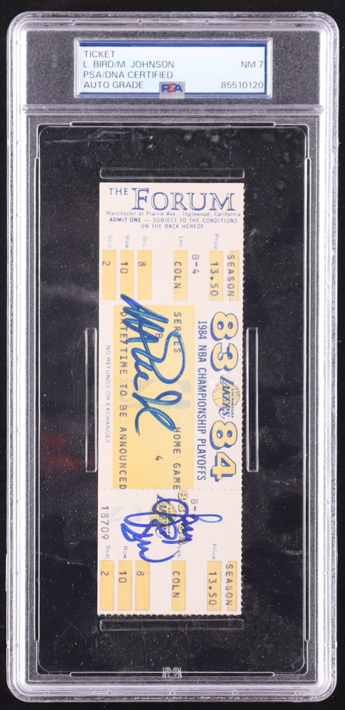 1984 Championship Playoffs ticket has been hand-signed by Magic Johnson (Los Angeles Lakers, HOF) and Larry Bird (Boston Celtics, HOF) and graded (PSA 7). Please see photos for details regarding the item.