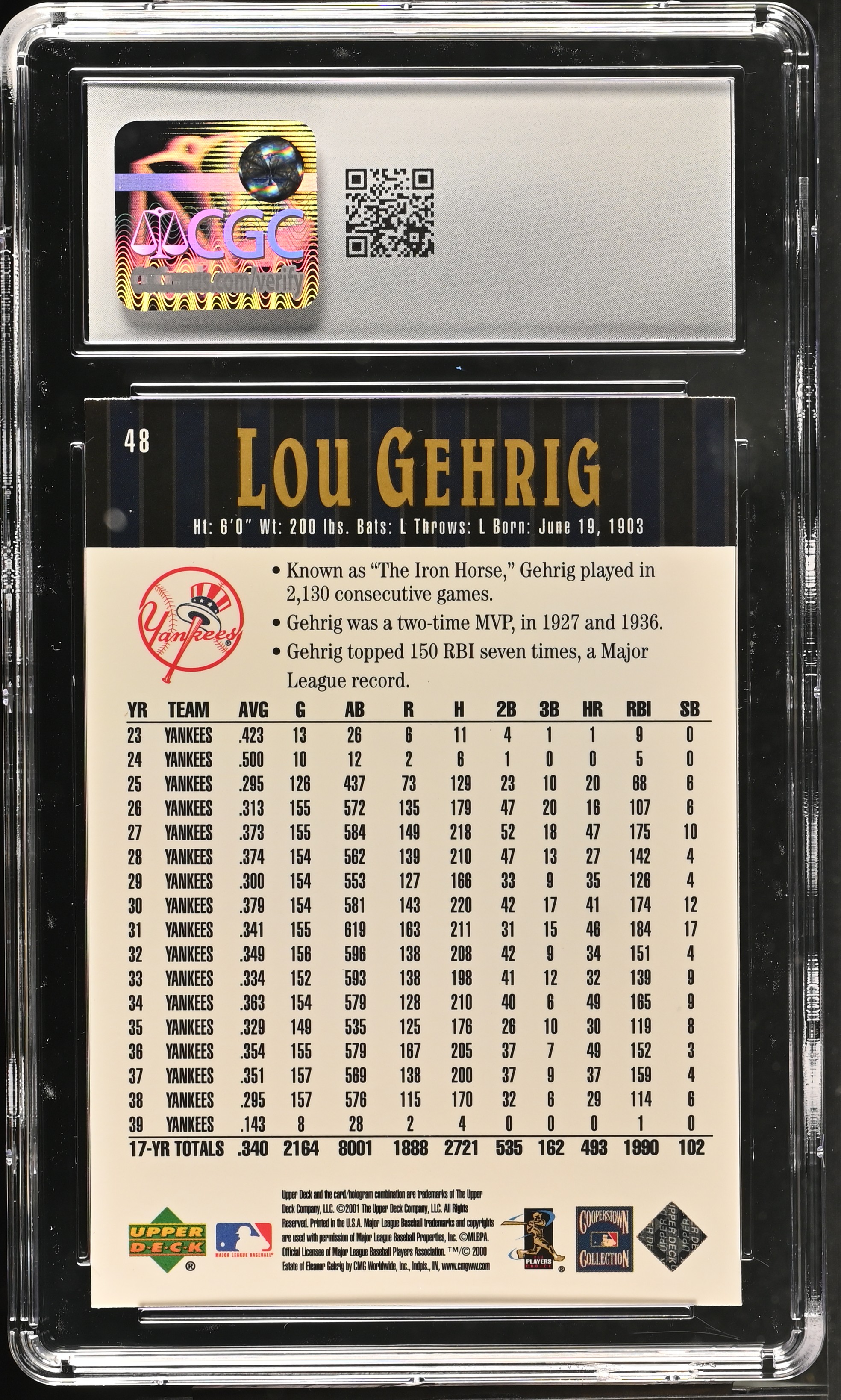 Lou Gehrig 2001 Upper Deck Hall Of Famers #48 (CGC 8)