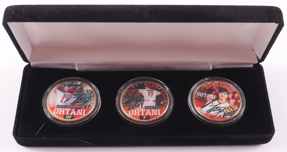 Set of (3) gold plated Shohei Ohtani (Los Angeles Angels) coins, which are the dollar, half dollar and quarter coins. Please see photos for details regarding the condition of the coins.