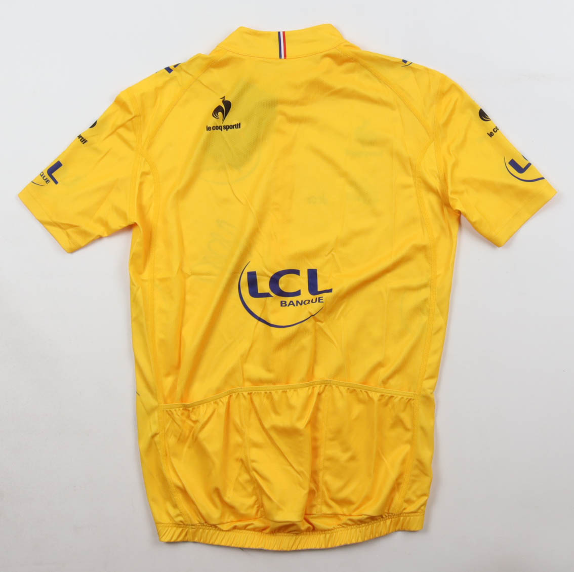Le Coq Sportif authentic jersey with everything pressed on, size M. Hand-signed by Bradley Wiggins.