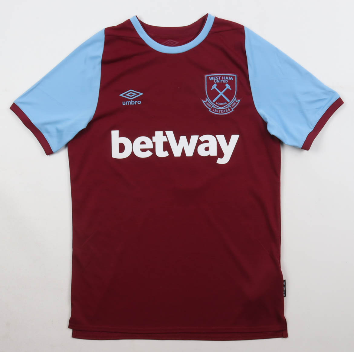 Umbro jersey with everything is pressed on, size M. Hand-signed by Declan Rice (West Ham United F.C.). Please note, there is staining on the left sleeve. See photos regarding the condition of the item.