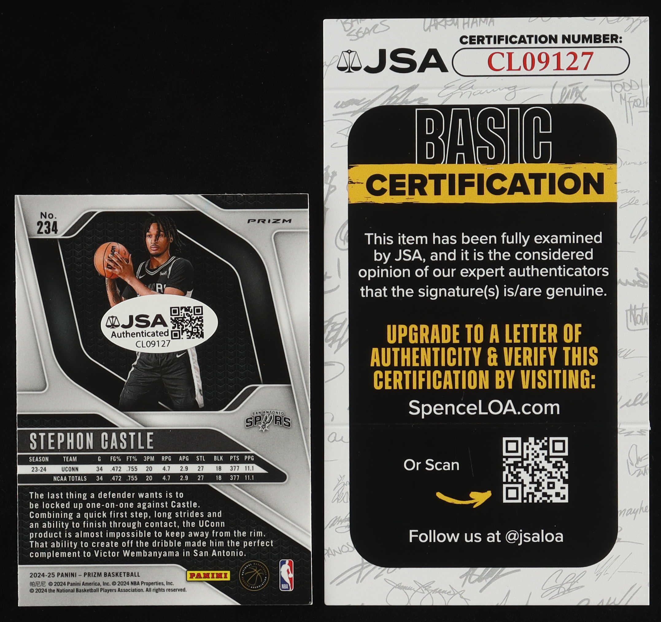 Trading card has been hand-signed by Stephon Castle (San Antonio Spurs). Please refer to photos for the condition of the card.