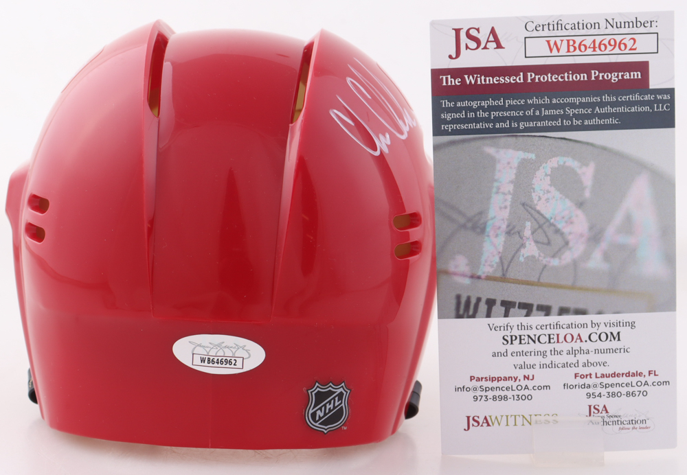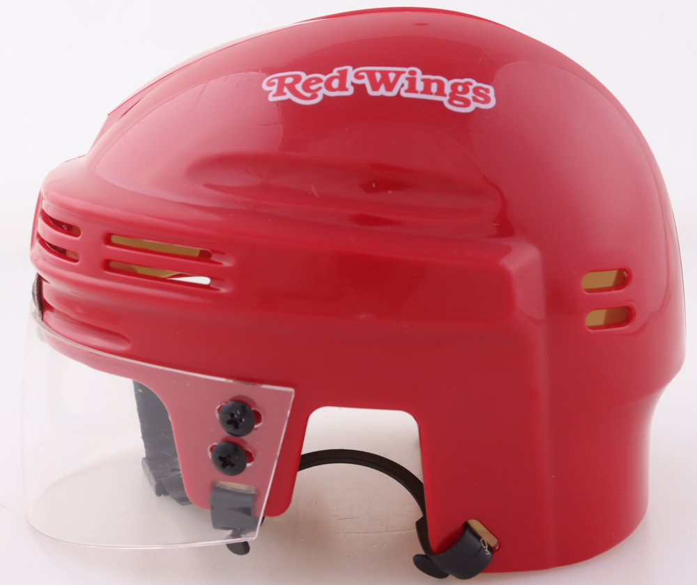 Detroit Red Wings mini helmet has been hand-signed and inscribed by Chris Chelios (HOF).