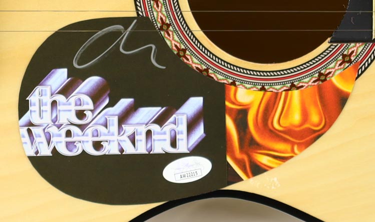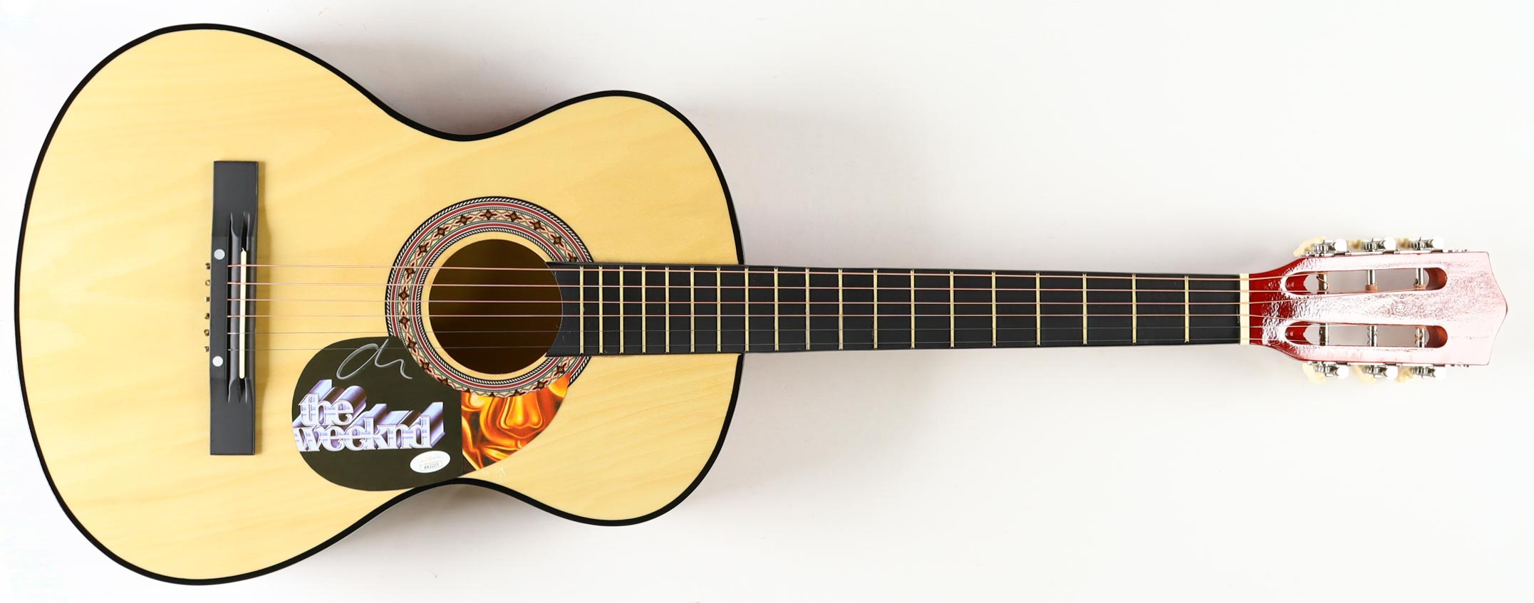 Acoustic guitar measures approximately 38" in length and has been hand-signed by The Weeknd on a CD insert that has been repurposed as the pickguard.