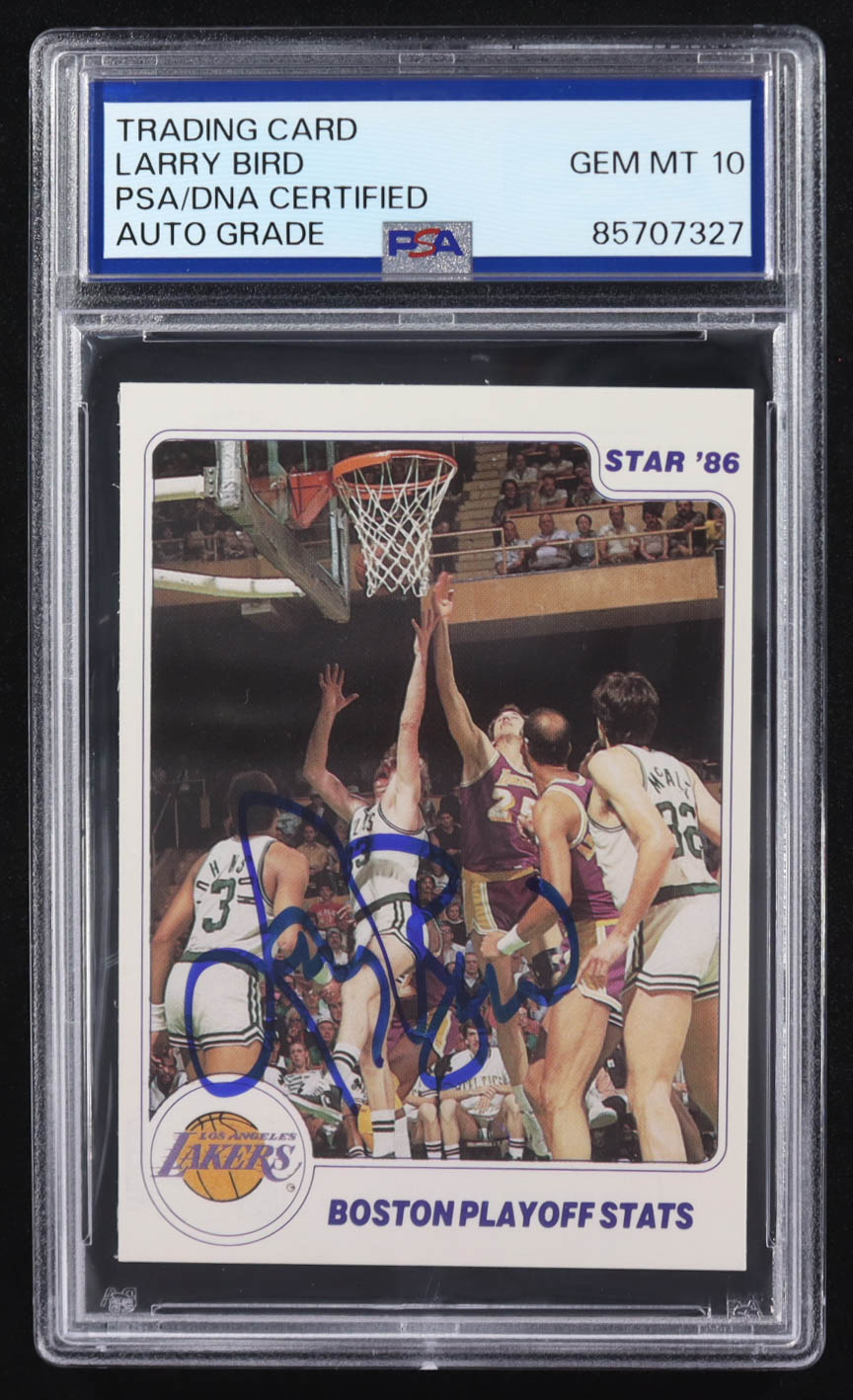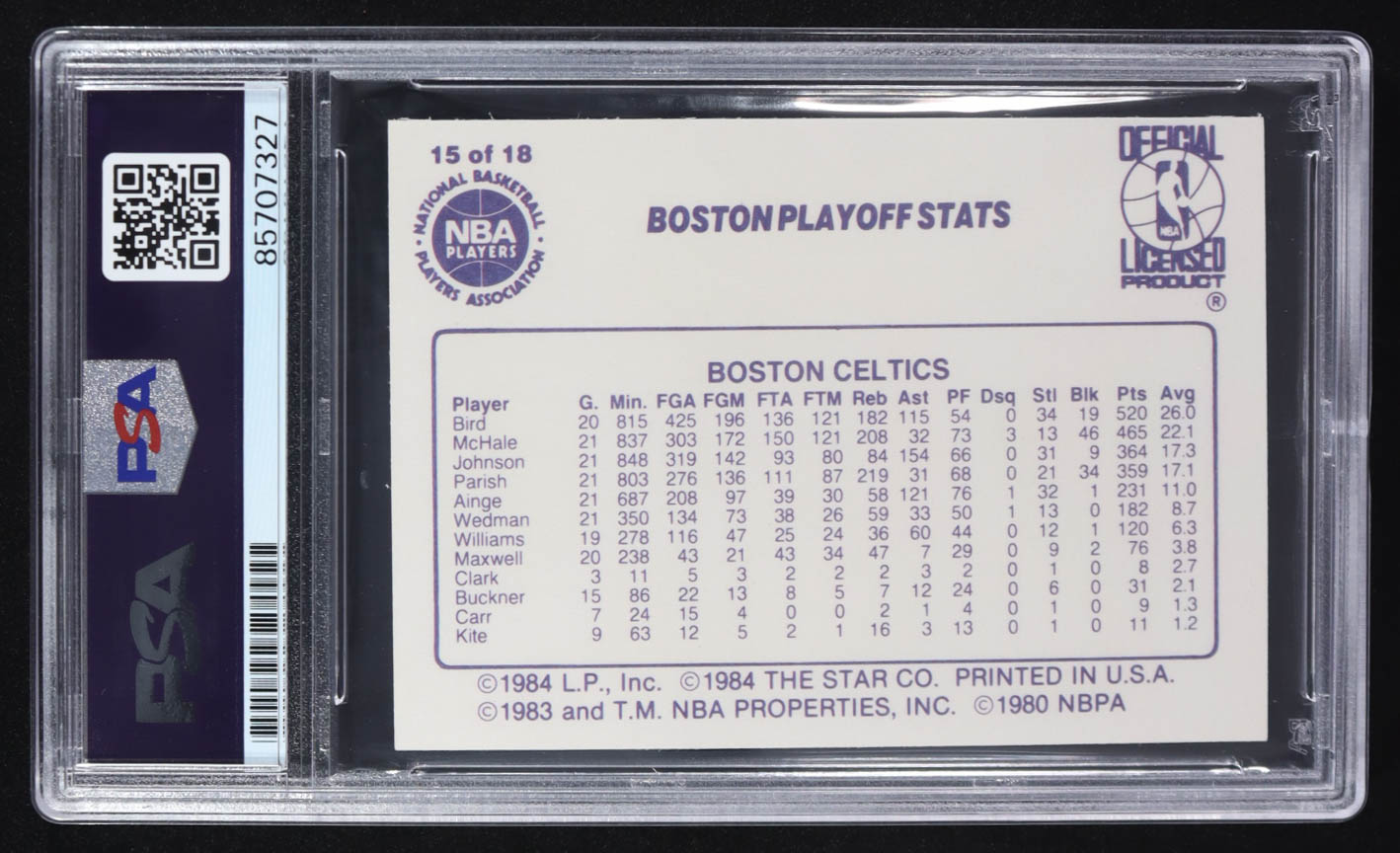 Larry Bird Signed 1985-86 Star Lakers Champs #15 Boston Playoff Stats (PSA | Auto Grade 10)
