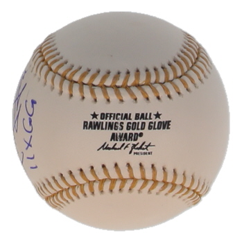 Rawlings Gold Glove Award baseball has been hand-signed and inscribed by Omar Vizquel (Cleveland Indians).