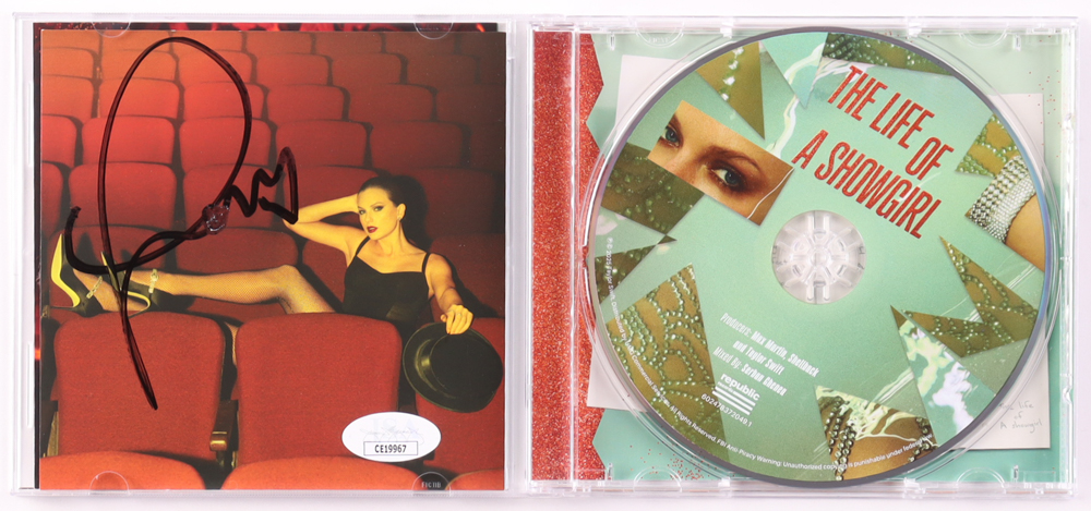 "The Life of a Showgirl" CD album insert has been hand-signed by Taylor Swift. The disc and case are included as shown. Please note, the top left corner of the case is cracked, and the signature is smudged. See photos for more detail regarding the condition of the item.