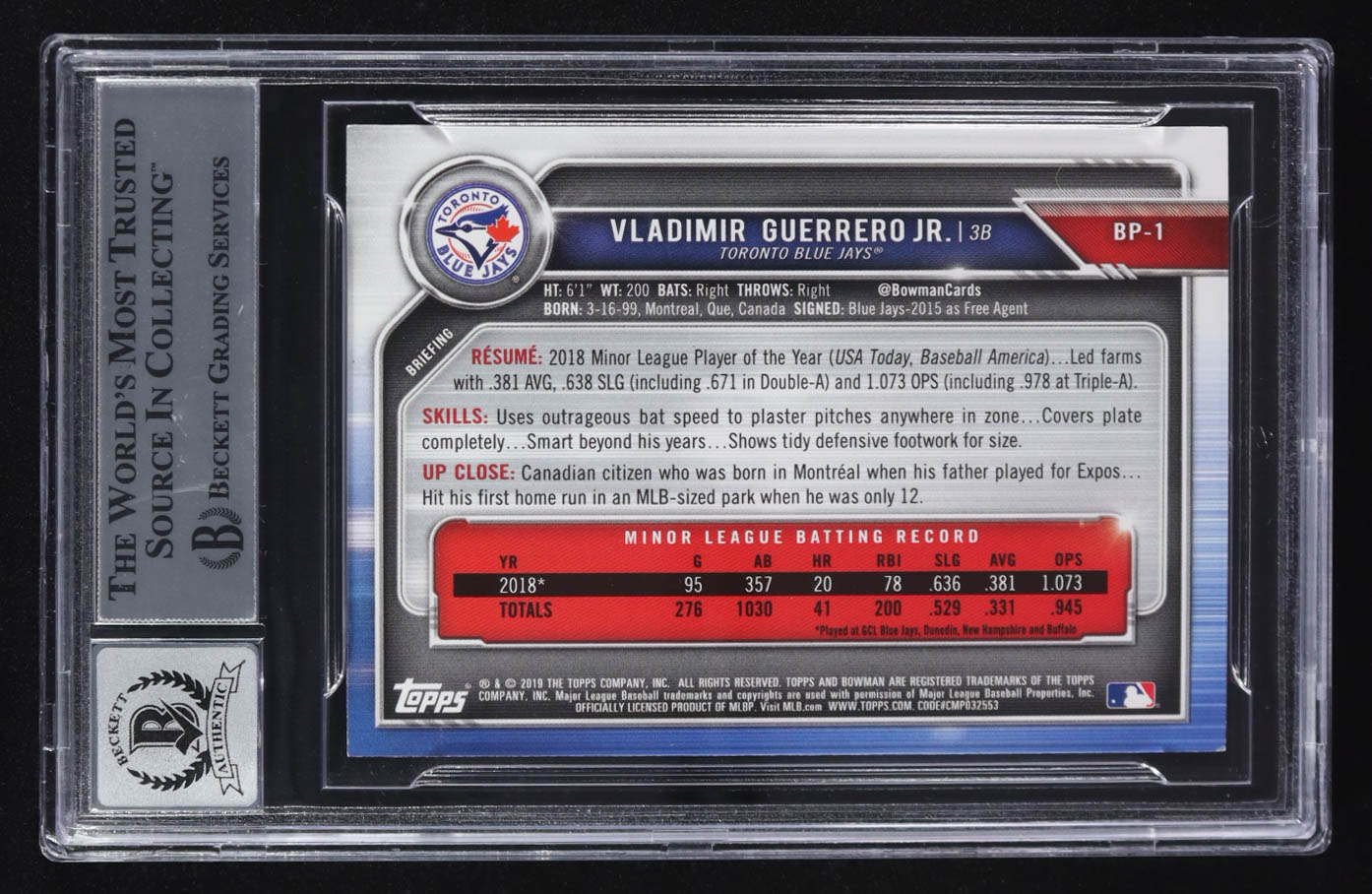 Vladimir Guerrero Jr. Signed 2019 Bowman Prospects Camo #BP1 (BGS | Auto Grade 10)