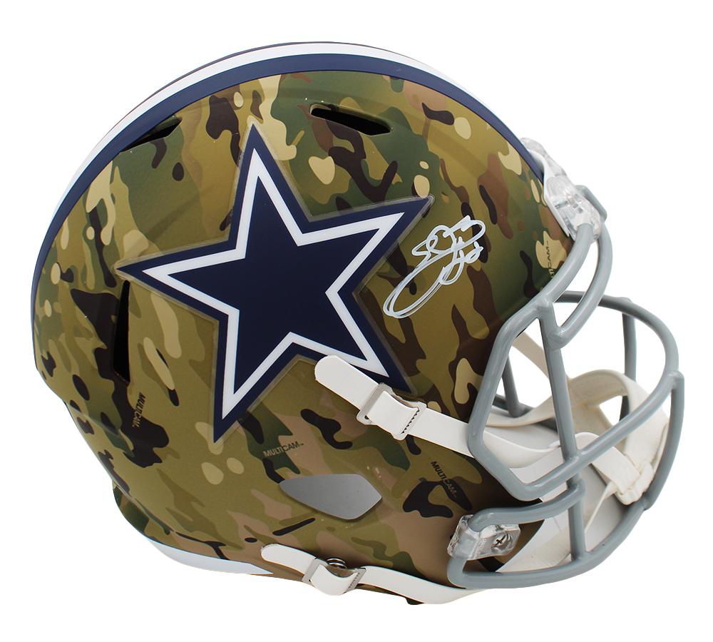 Riddell Dallas Cowboys full-size Camo Alternate Speed helmet has been hand-signed by Emmitt Smith (HOF).