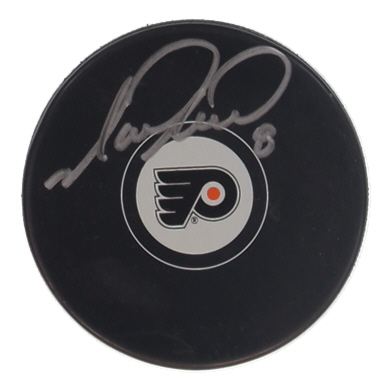 Philadelphia Flyers logo hockey puck has been hand-signed and inscribed by Mark Recchi (HOF).