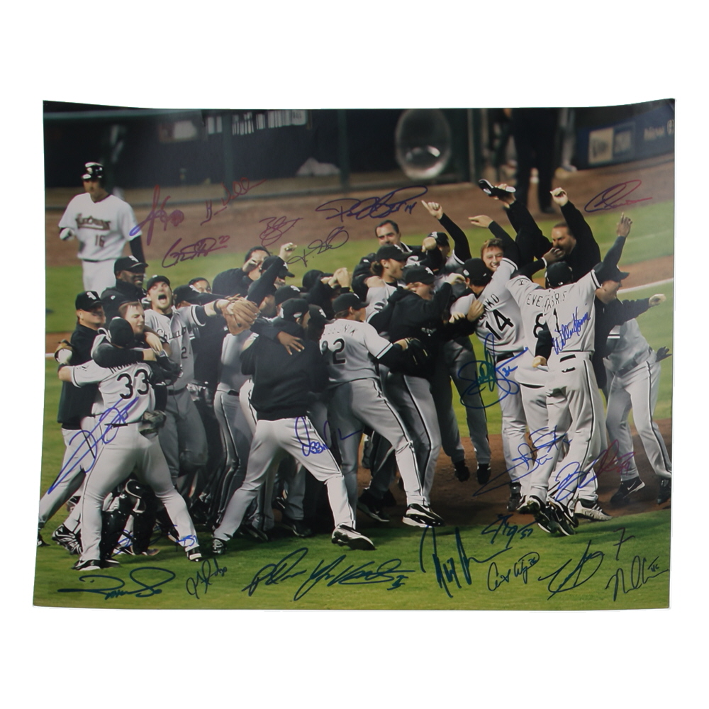 Photo measures approximately 16" x 20" in size and has been team-signed by (23) with Ozzie Guillen, Frank Thomas, Luis Vizcaino, Paul Konerko, Neal Cotts, Carl Everett, Jeff Bajenaru, Willie Harris, Greg Walker, Freddy Garcia, Jon Garland, Dustin Hermanson, Damaso Marte, Brian Anderson, Cliff Politte, Raul Casanova, Geoff Blum, Pablo Ozuna, Juan Uribe, Timo Perez, Joey Cora, and (2) others. Please note, a few signatures have been smudged and there are creases throughout the photo.