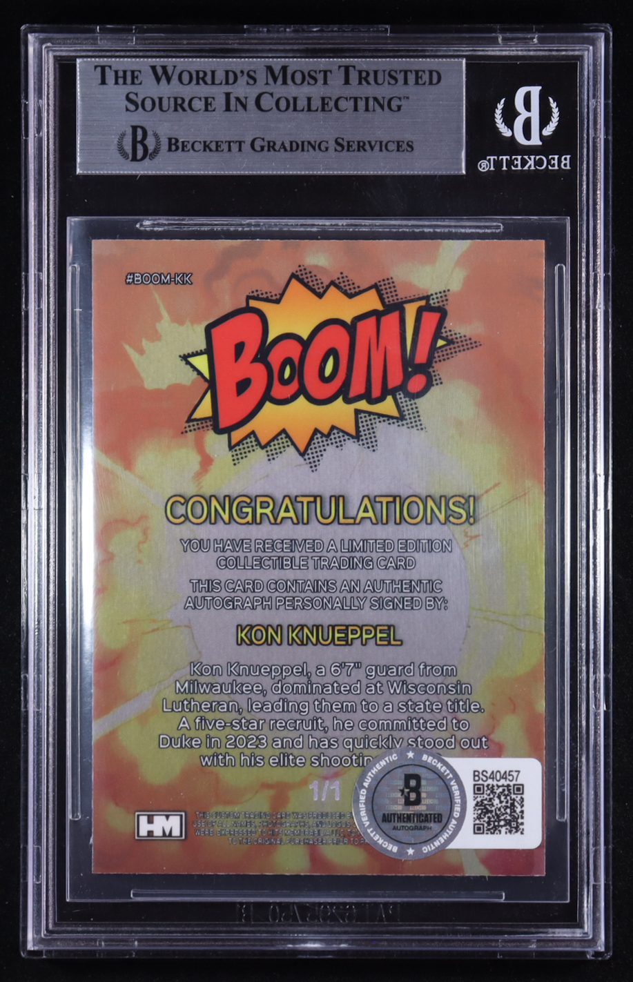 Kon Knueppel Signed Boom! Custom Trading Card #BOOM-KK RC #1/1 (BGS)