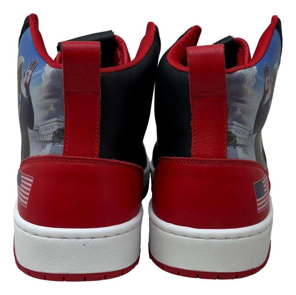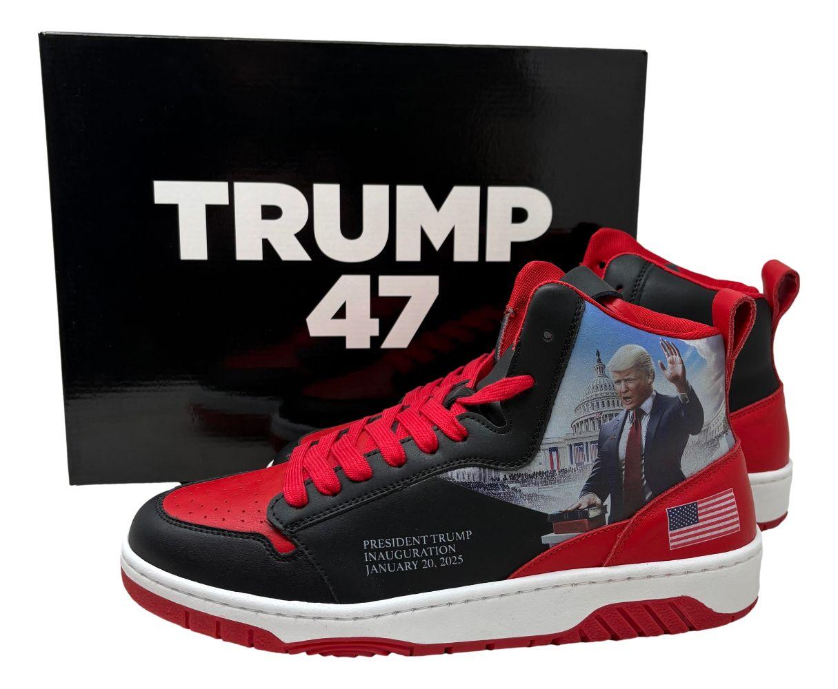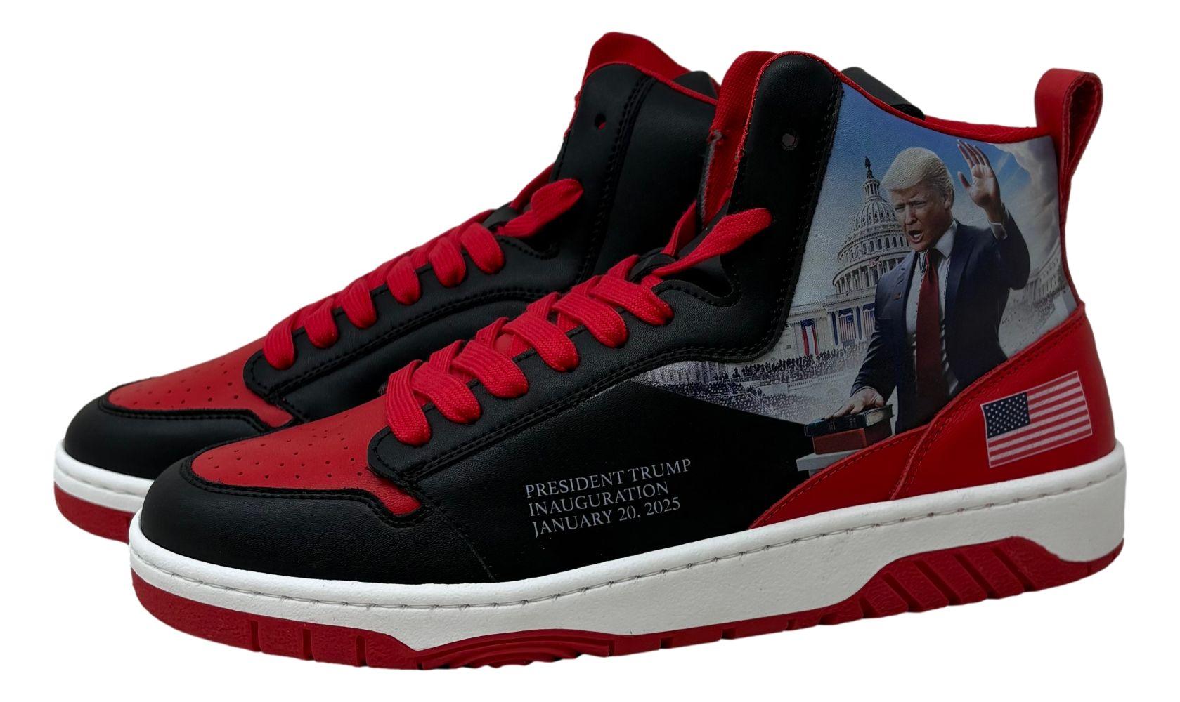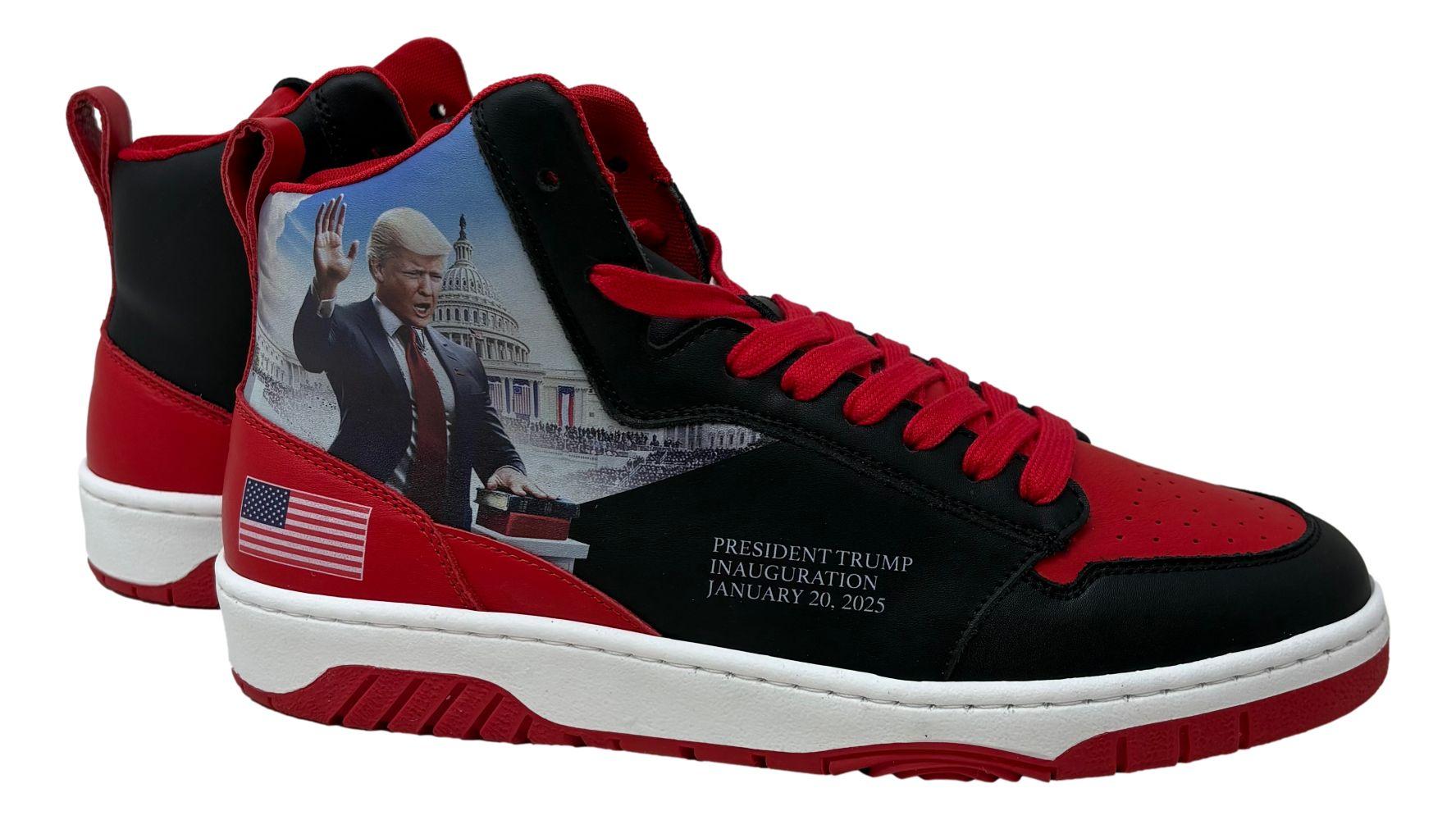 Mark the historic inauguration of President Trump as the 47th President of the United States on January 20, 2025 with the bold Inauguration Commander High-Tops. Designed in striking black and red, these sneakers exude strength, power, and patriotism. Featuring a detailed portrait of President Trump with his hand on the Bible, these sneakers capture American history in the making. Celebrate Trump's leadership, resilience, and victory. These sneakers would make a great addition to any collection!
