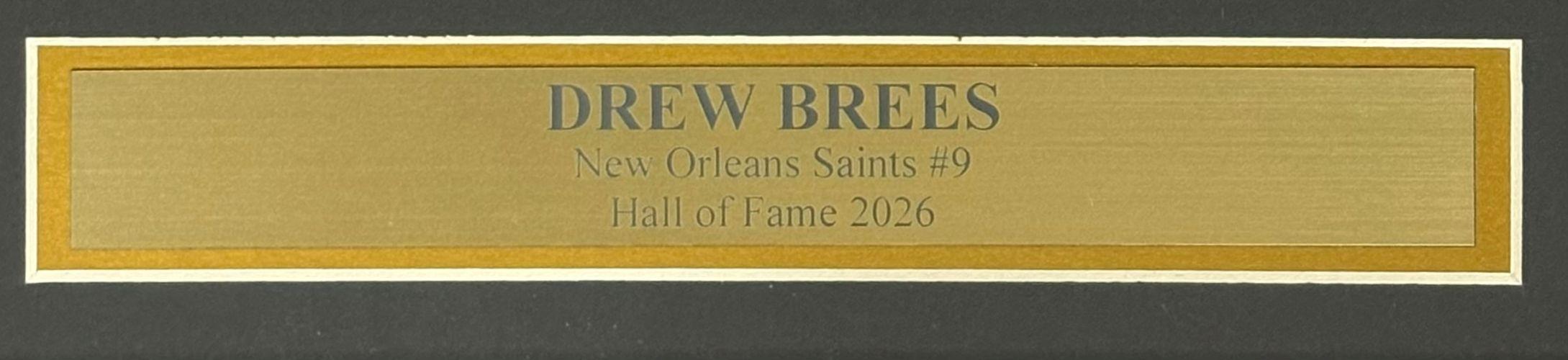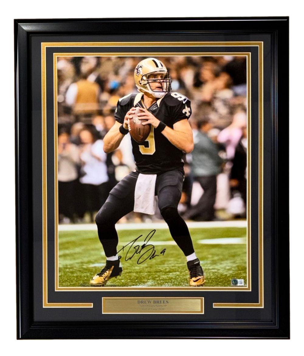 Custom frame measures 22” x 29” in size and features a photo that has been hand-signed by Drew Brees (New Orleans Saints).