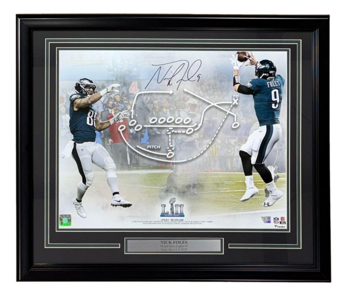 Custom frame measures 22” x 27” in size and features a photo that has been hand-signed by Nick Foles (Philadelphia Eagles).