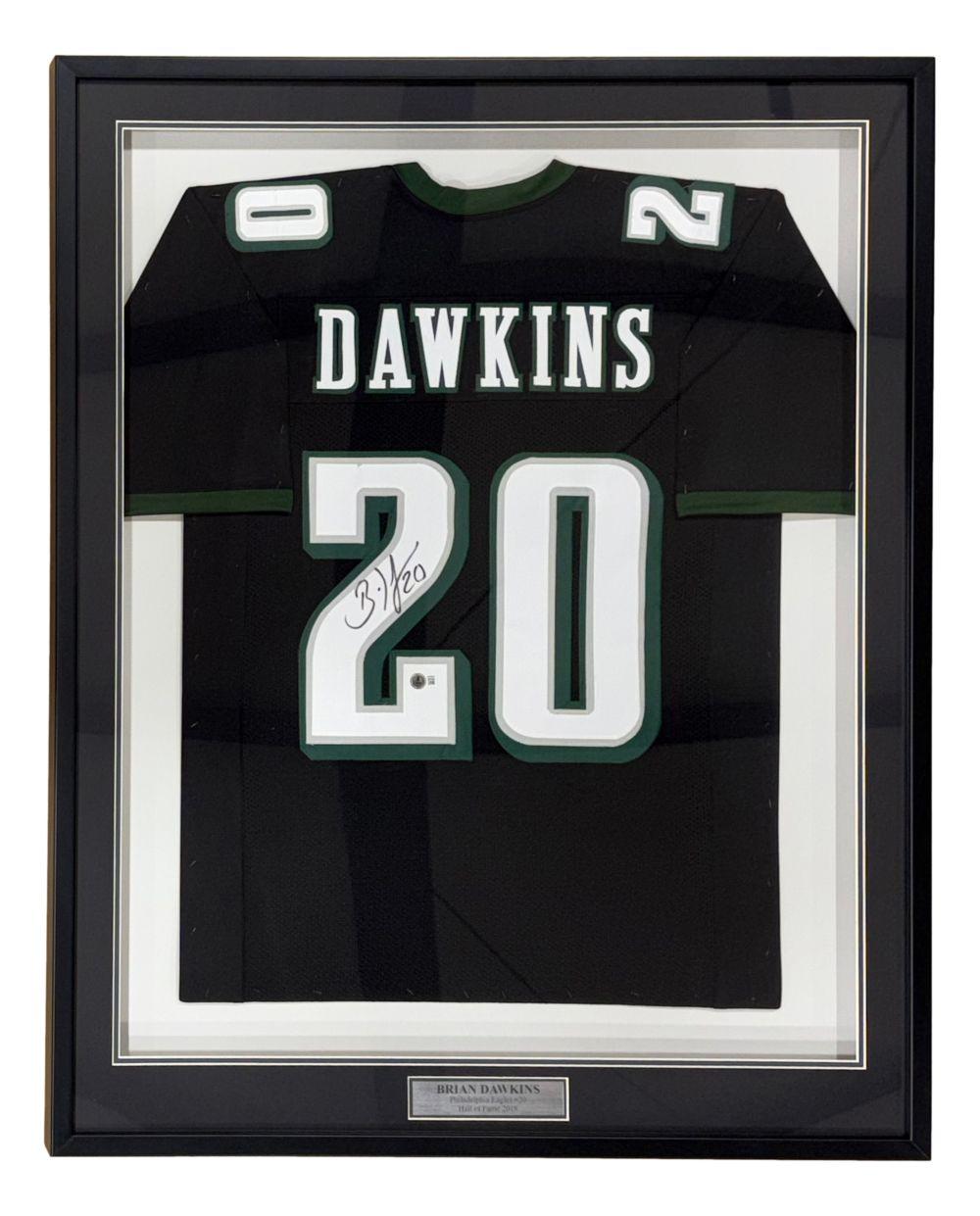 Custom frame measures 32" x 42" in size and features a jersey that has been hand-signed by Brian Dawkins (HOF).
