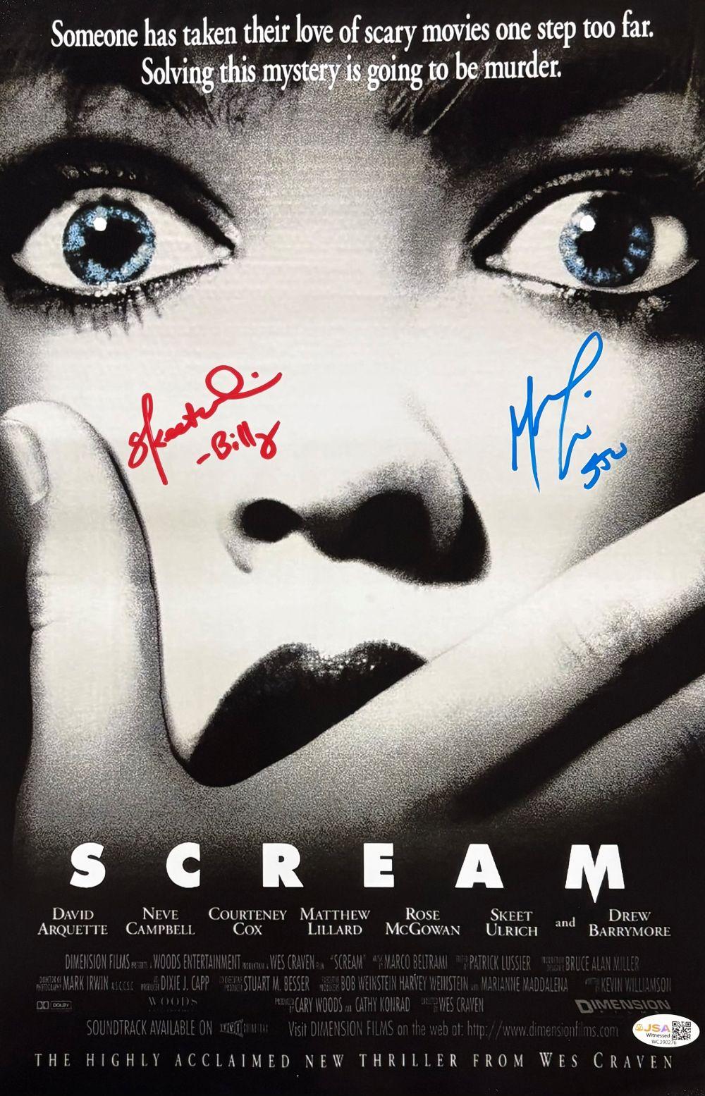 Movie Poster measures 11” x 17” in size and has been hand-signed and inscribed by Matthew Lillard (Stu) and Skeet Ulrich (Billy).