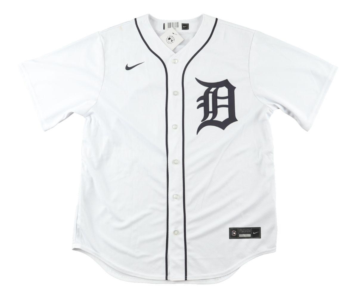 Nike jersey with everything sewn on, size L. Hand-signed by Riley Greene (Detroit Tigers).