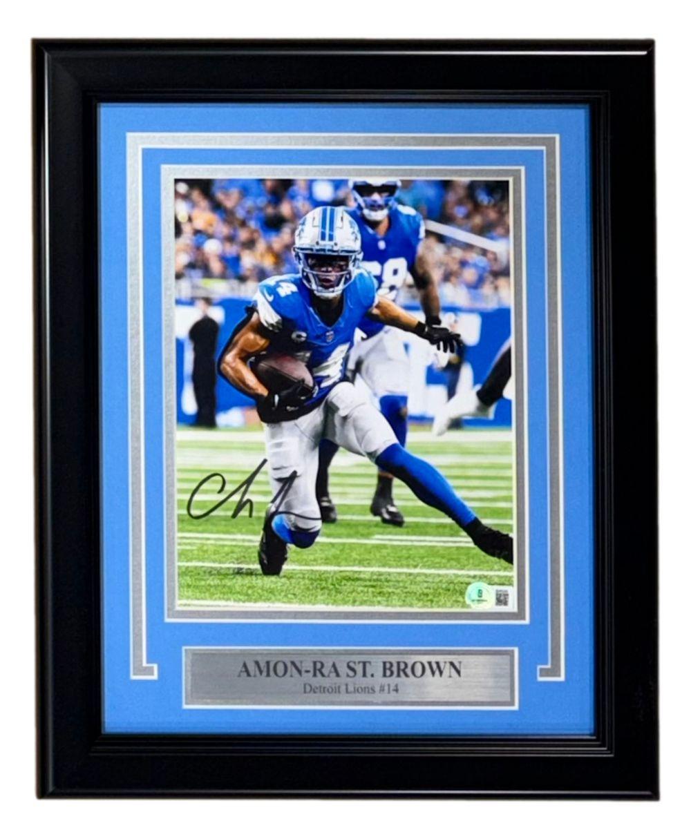 Custom frame measures 11” x 14” in size and features a photo that has been hand-signed by Amon-Ra St. Brown (Detroit Lions).