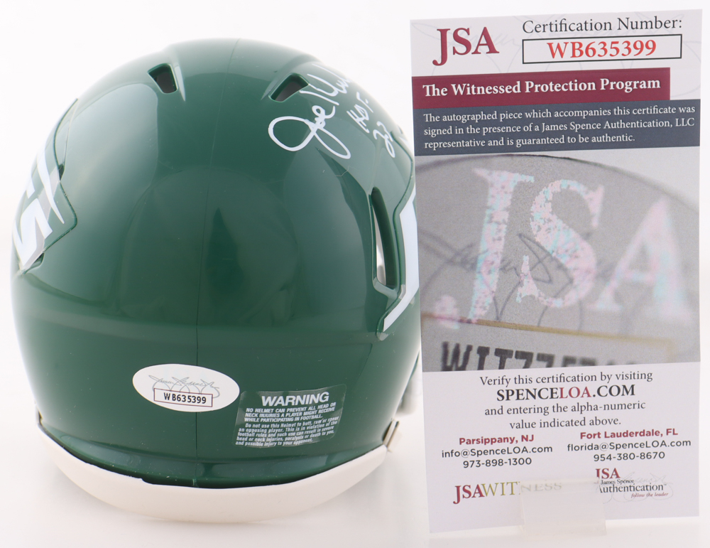 Riddell New York Jets Speed mini helmet has been hand-signed and inscribed by Joe Klecko (HOF).