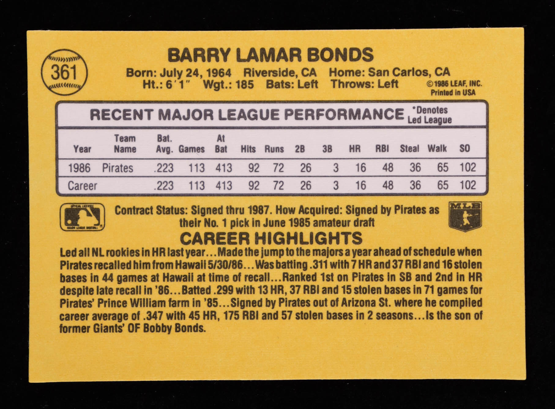 Barry Bonds 1987 Donruss #361 RC