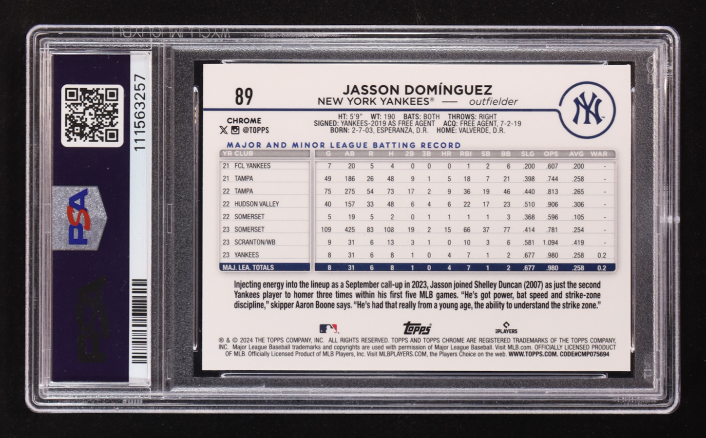 Jasson Dominguez 2024 Topps Chrome Pink Refractors #89 RC (PSA 9)