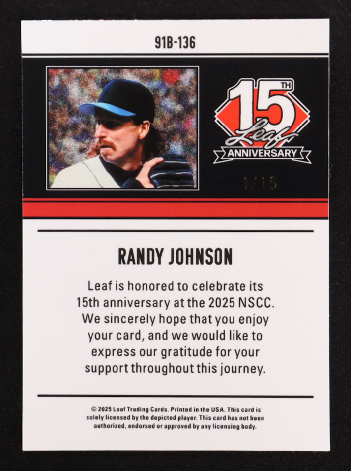 Randy Johnson 2025 Leaf 15th Anniversary Silver Sparkle #91B136 #1/15