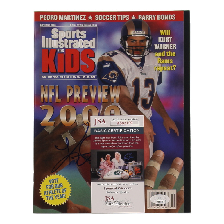 September 2000 issue of Sports Illustrated for Kids magazine. Hand-signed by Kurt Warner (St. Louis Rams, HOF).
