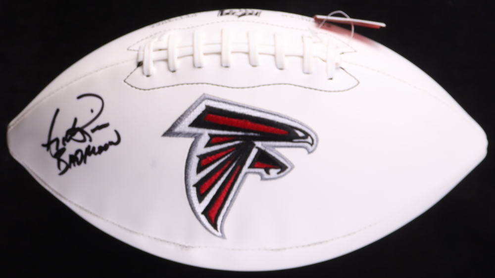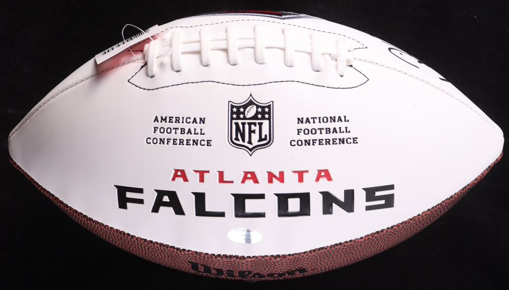 Atlanta Falcons logo football. Hand-signed and inscribed by Andre Rison. Please note there is staining on the white panels of the football.
