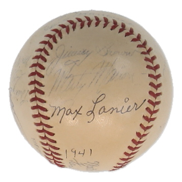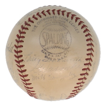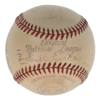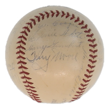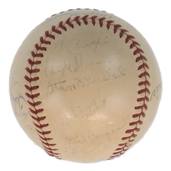 Spalding Official National League Baseball. Hand-signed and inscribed by Enos Slaughter, Stan Musial, Ray Sanders, Johnny Hopp, Mort Cooper, Mike Gonzalez, Clyde Shoun, Walker Cooper, Gus Mancuso, Billy Southworth, Lon Warneke, Max Lanier, Jimmy Brown, Marty Marion, Harry Gumbert, Ernie White, Terry Moore, and (3) others. Please note, most of the signatures are fading and the baseball is naturally toning and stained.