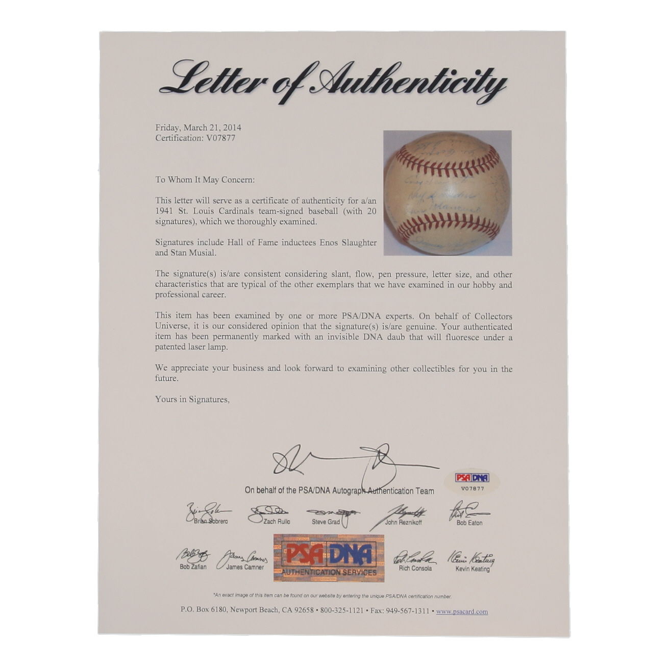1941 Cardinals ONL Baseball Team-Signed & Inscribed By (20) with Enos Slaughter, Stan Musial, Ray Sanders, Johnny Hopp (PSA)