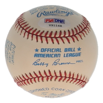 Rawlings Official American League Baseball. Hand-signed and inscribed by Bob Cain (D. 1997, Detroit Tigers). Please note, the inscriptions have been personalized "To Marty" and the baseball is naturally toning.