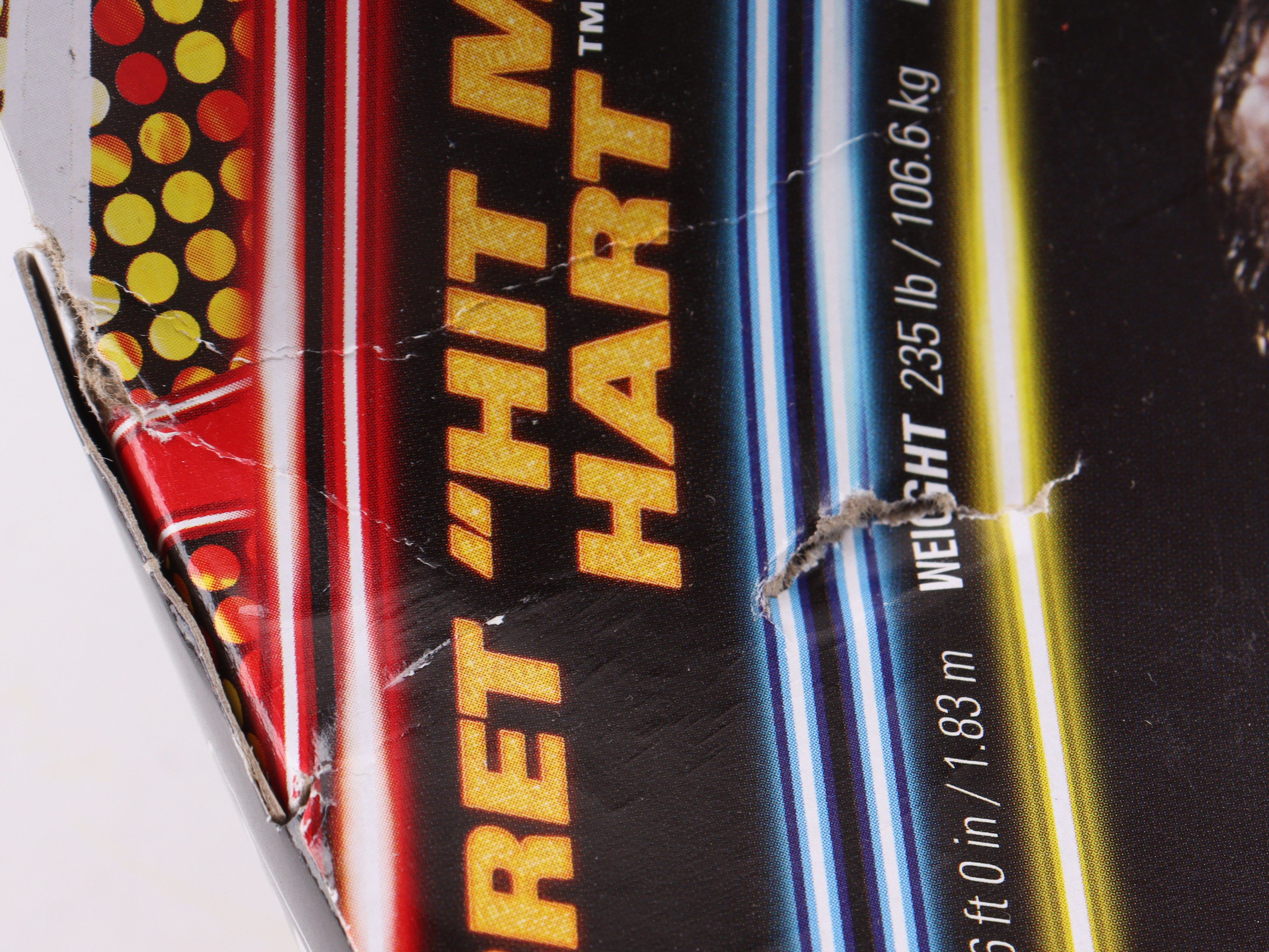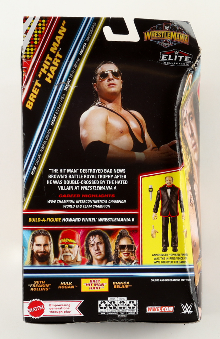 Mattel WWE WrestleMania Edition Collection action figure. Hand-signed on the box by Bret 'Hitman' Hart (HOF). Please note that the original packaging shows signs of damage.
