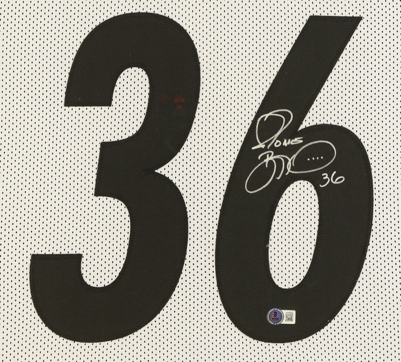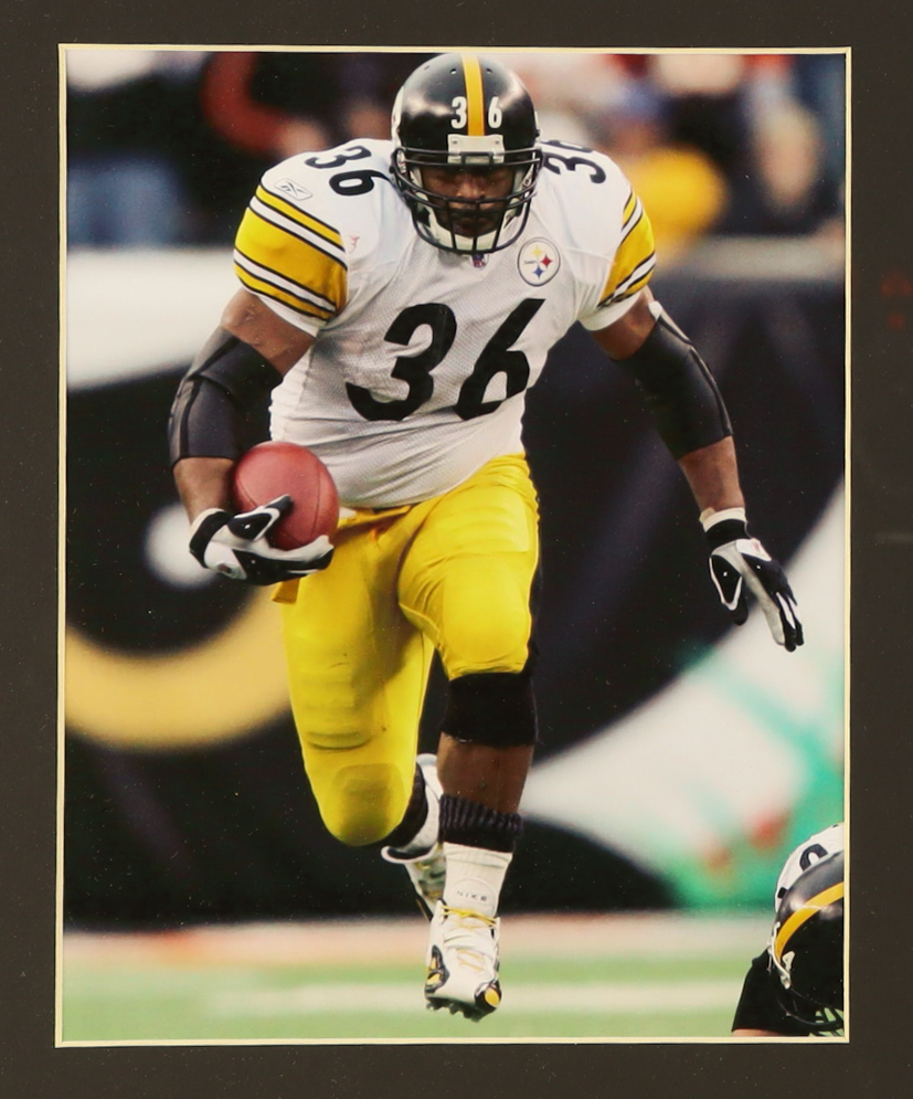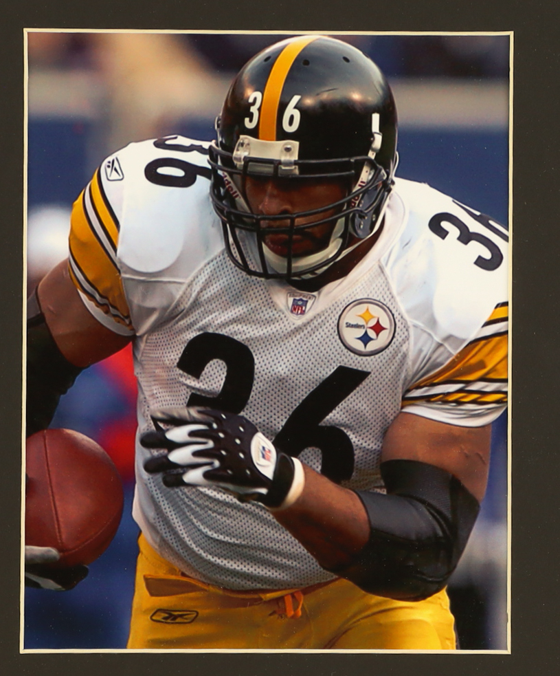 Custom framed display measures approximately 35" x 43" in size and features a jersey that has been hand-signed by Jerome Bettis (HOF). Please note, the 8x10 photos may be in reverse order.